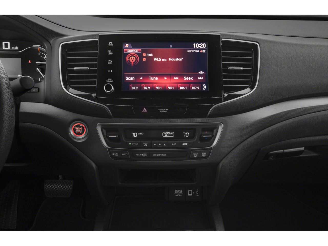 - Radio: 215-Watt Audio System w/7 Speakers -inc: subwoofer, Bluetooth streaming audio, MP3/auxiliary input jack, Radio Data System (RDS), Speed-Sensitive Volume Compensation (SVC), 8" display audio w/high-resolution electrostatic touch screen and customizable feature settings, Apple CarPlay compatibility, Android Auto compatibility, HondaLink, SMS text message function (Compatible w/select phones w/Bluetooth, Your wireless carrier's rate plans apply, State or local laws may limit use of texting feature, Only use texting feature when conditions allow you to do so safely.) and 1.5-amp USB smartphone/audio interface in front console (1 port)